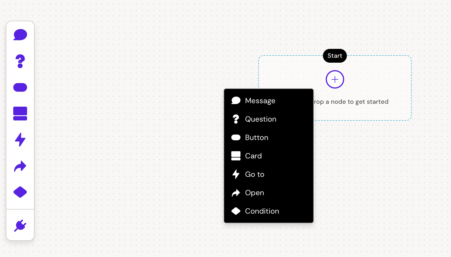 on the canvas and select Message in the dropdown or by dragging the message node in from the left sidebar. In the sidebar you can see all node types. Some node types might not be allowed to be placed underneath each other, and will therefore not be visible in the dropdown or cannot be dropped into the tree from the sidebar when building.