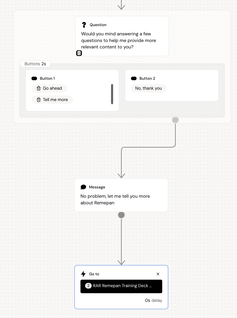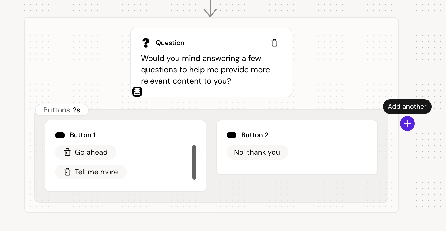 Adding multiple buttons will create separate paths that the user can take. If they select “No, thank you”, we want to present them with a path that does not include ‘personal’ questions.