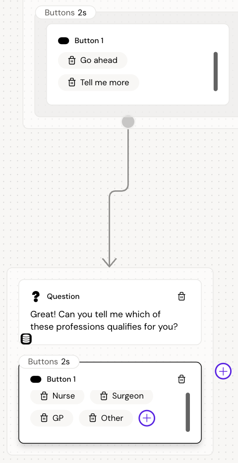 below the left button to add a Question for that path. Ask the user about their profession and add the possible answers in one button below.