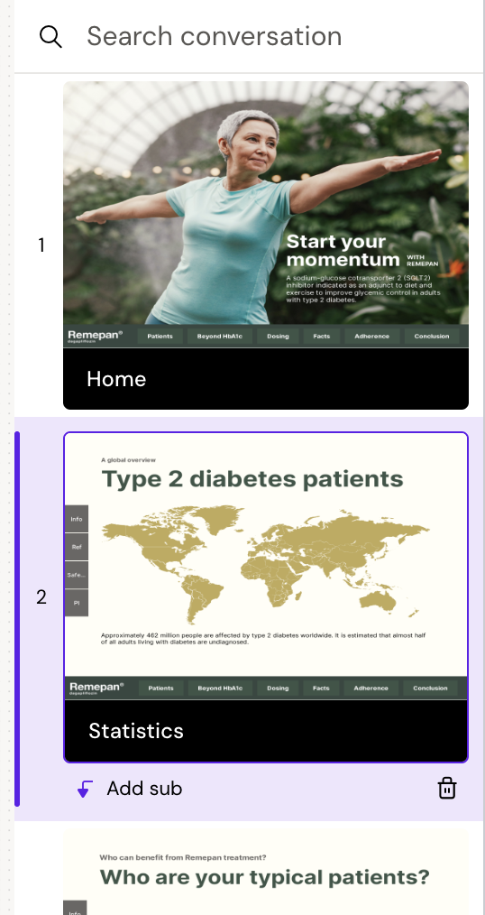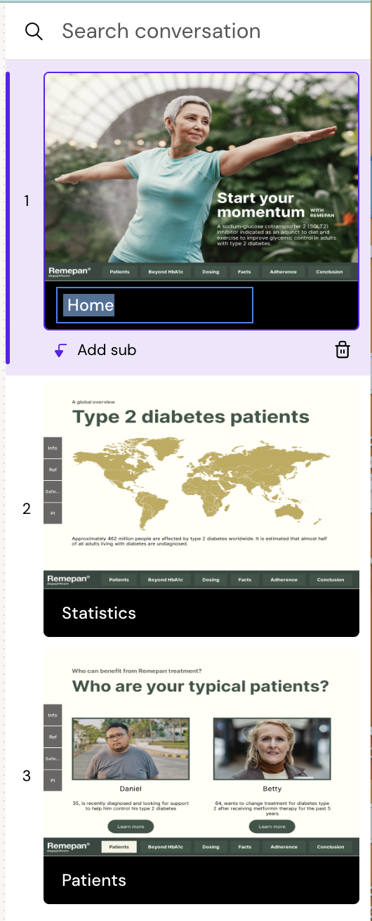 When the builder is loaded, you will see your slides in the right panel. Each slide is a conversation, and the conversations should be linked to each other to guide the user through the e-Detail. Different slides can be shown based on users interests.