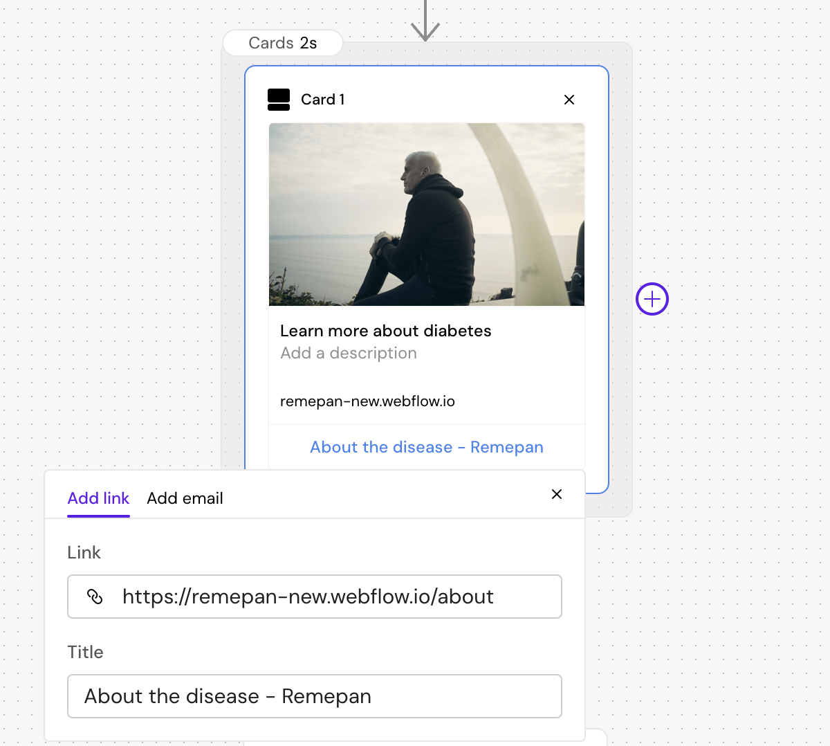 Lets add an image, a headline and a link to the website https://remepan-new.webflow.io/about to tell the users more about diabetes.