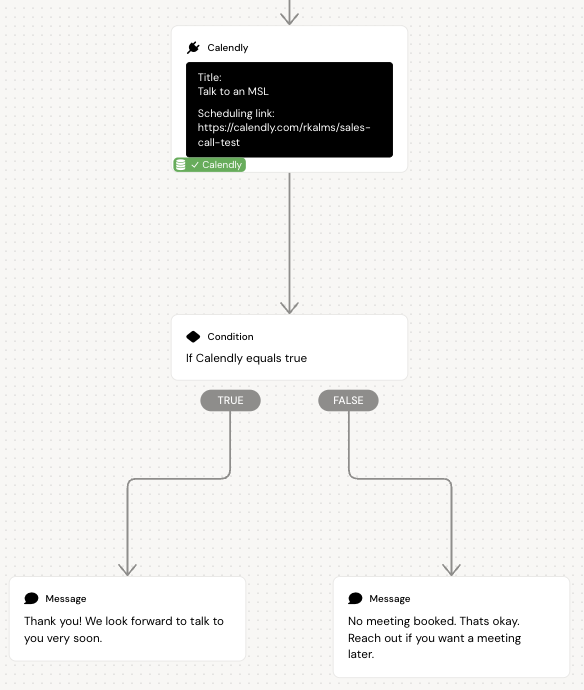 We can further more detect if a meeting have been booked, and use a condition node to provide the user with different messages based on if they successfully booked a meeting or not.