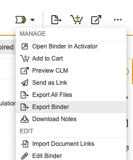 In the top right, click the “All Actions” menu (shown as “···”) and select the “Export Binder” option.
