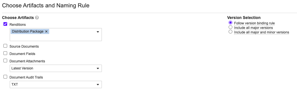 In the next screen of “Choose Artifacts and Naming Rule”, check the top checkbox next to “Renditions” and set it to use the “Distribution Package” instead of the “Viewable Rendition”.