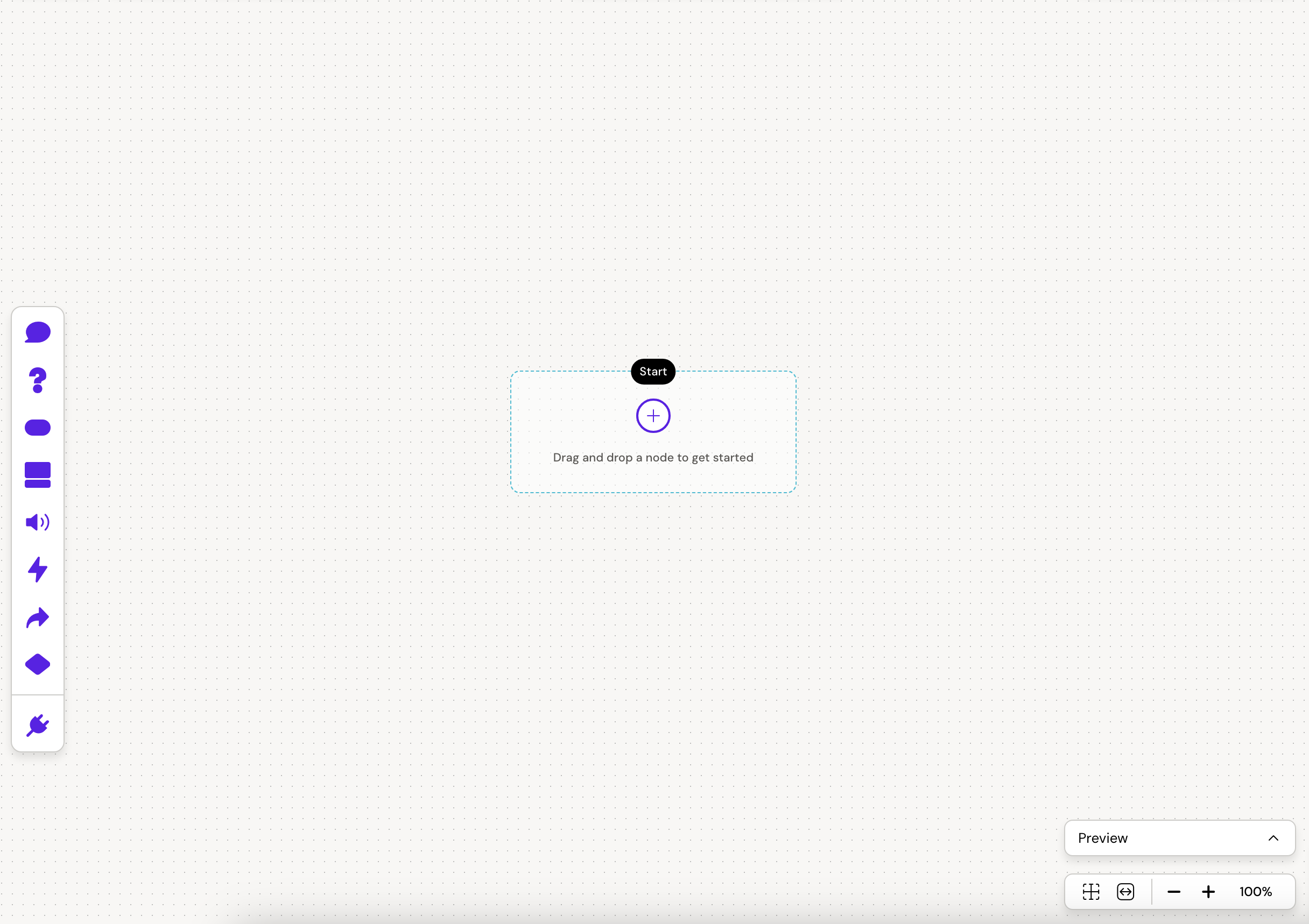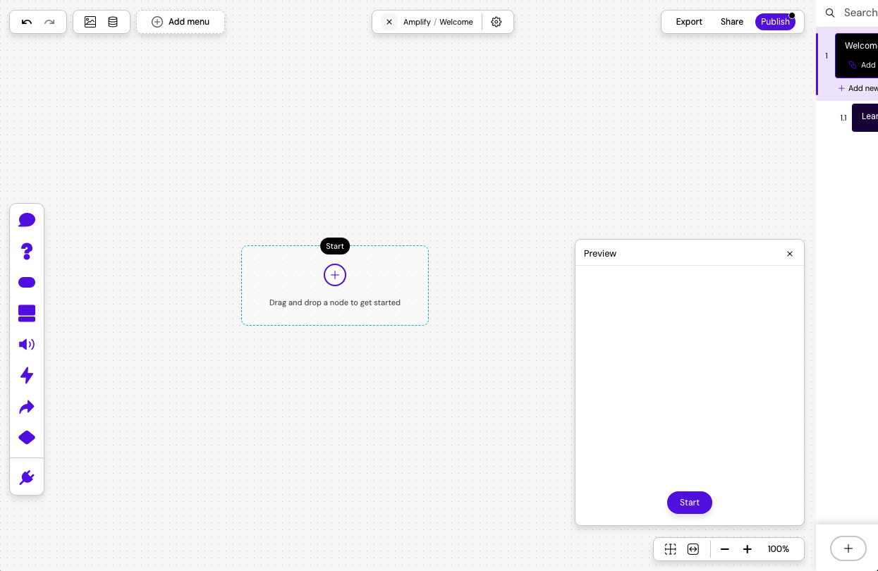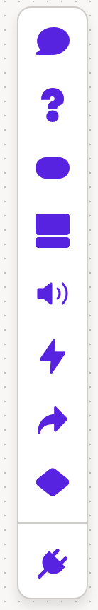 The toolbar contains all node types: message, buttons, questions, cards, player, go-to, open, condition and a section for custom plugins. The toolbar is found on the left side of the canvas. Learn more about the nodes.