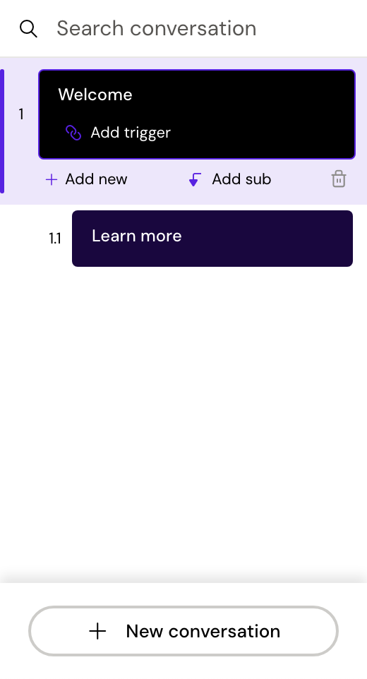 The conversation panel contains all your conversations. Conversations can have sub conversations, as a way to group related conversations and you can have as many conversations and sub conversations as you like. Conversations should be named relevantly as these names will be exposed to users.