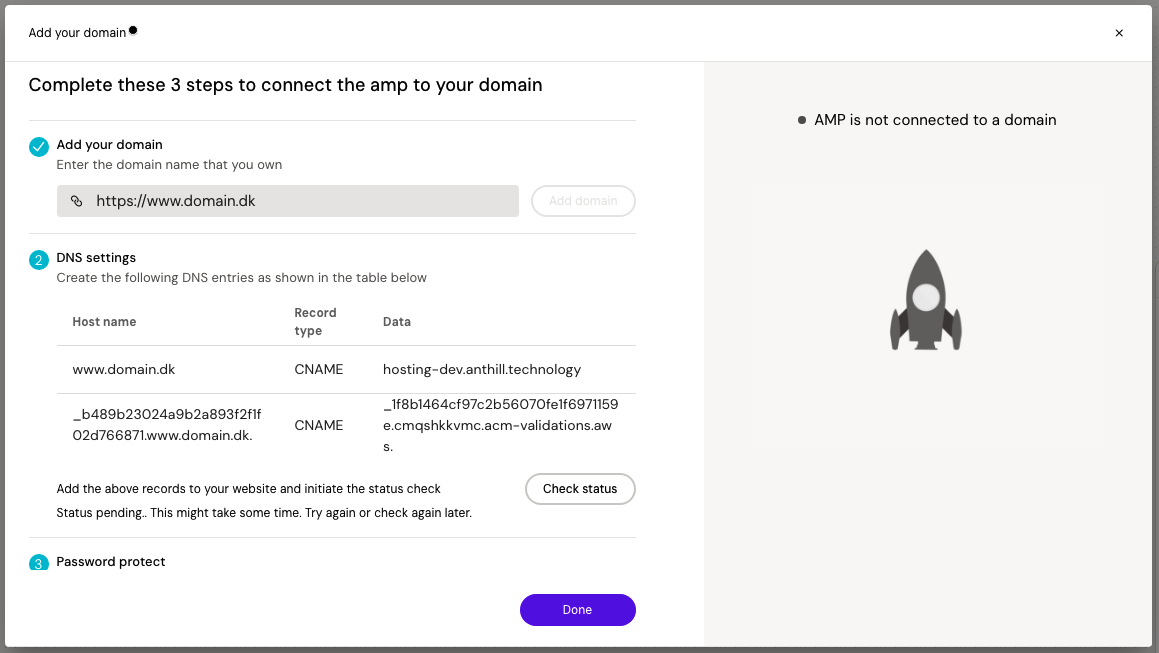 Once the DSN settings have been correctly configured on the domain, the validation will be successful and the amp can now be published to the domain.