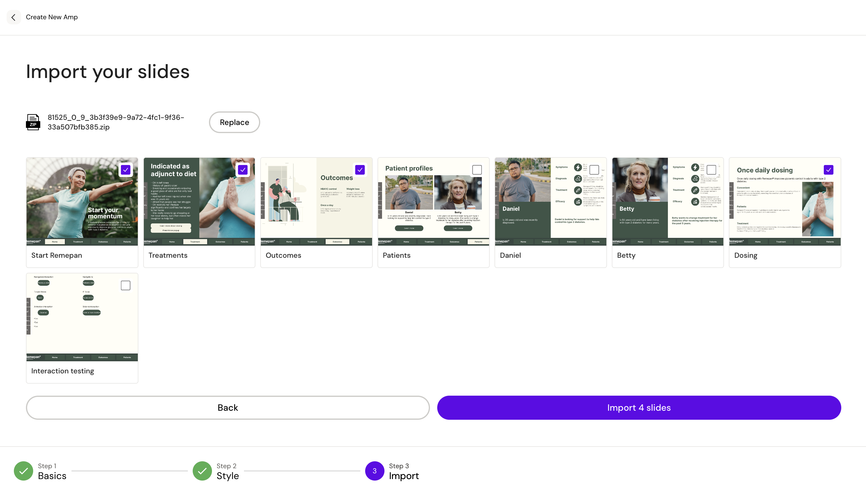 When importing an eDetailer zip to a self-detailer amp in Amplify, you now have the option to choose the specific slides you want to built conversations for.