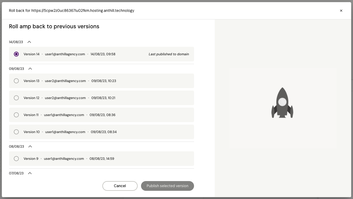 In the publish popover of an amp you will now see a new button called “Publish older version”. Clicking this will open a popup, that includes a list of all published versions of the amp. By selecting one of these versions and thereafter clicking on the “Publish selected version”, it is possible to publish an older version of the amp to the specific targeted domain.