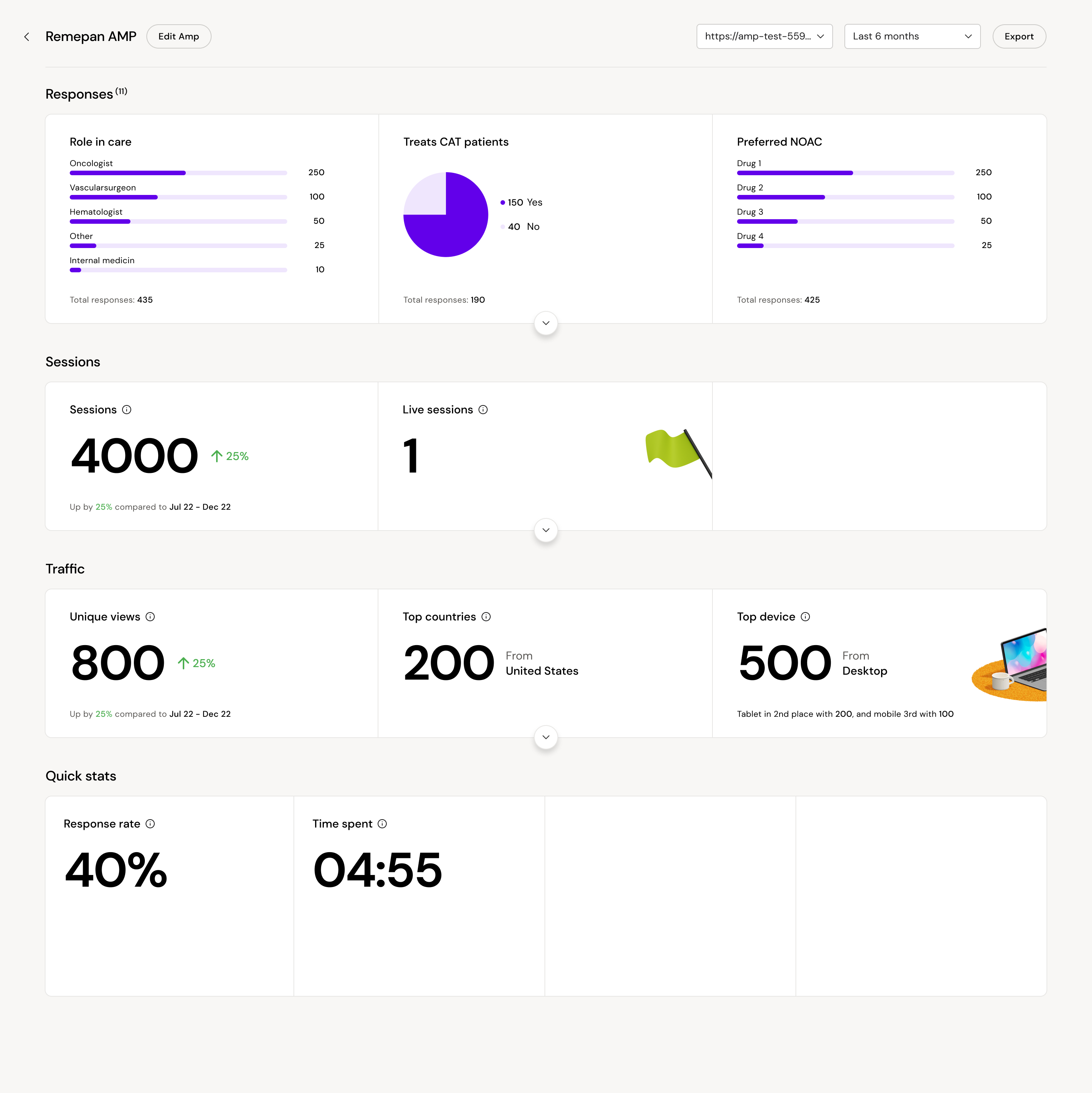 An ‘Insights’ button is now available in the dropdown on any Live amp. Once people start interacting with your live amp, insights such as responses to questions, number of sessions, country and device data and time spent can be seen on the insights page.